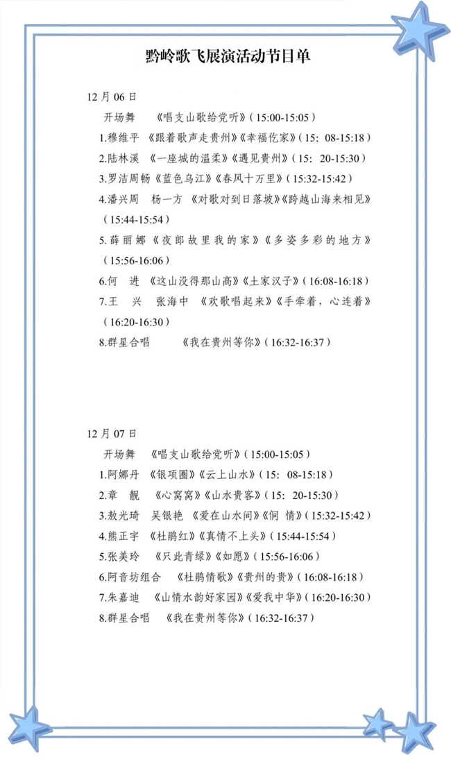 为全面展示近年来“黔岭歌飞”优秀民族歌曲征集活动的成果,进一步铸牢中华民族共同体意识,丰富各族群众精神文化生活,贵州省第五届“黔岭歌飞”优秀民族歌曲展演活动将于12月6日至7日下午在多彩贵州城举行。